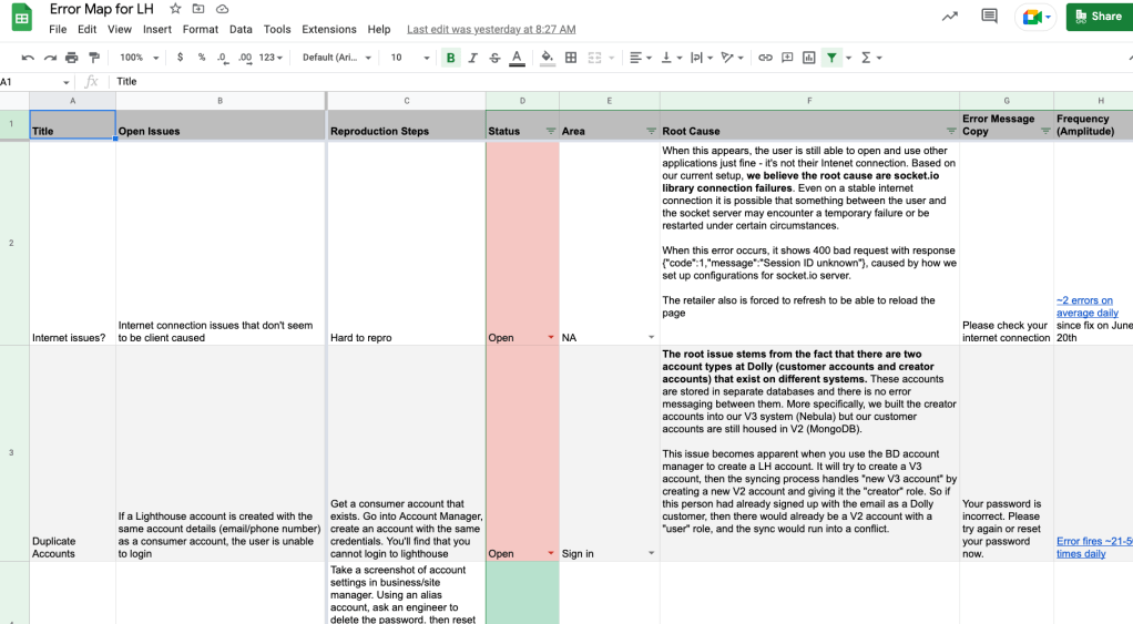 Using Amplitude, I begin to draw up an error audit log to better delve into the issues and identify core problems so that we could work on the right solutions.