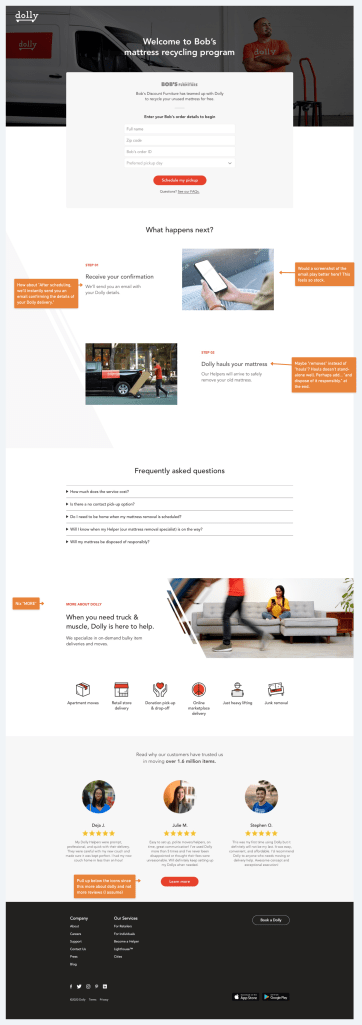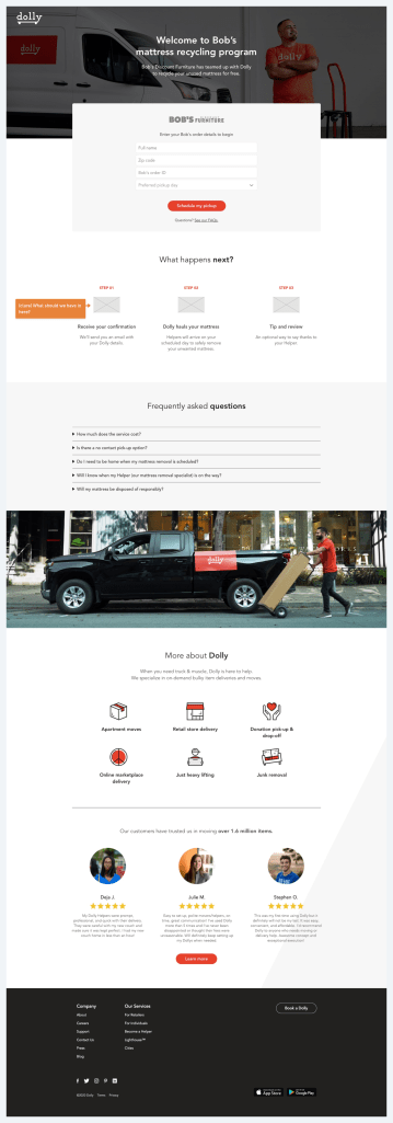 Result: Built the solution fast, making Dolly the first to offer haul away for California specifically for mattresses. Capitalized on conversion we would not have seen if we did not have the solution in place!